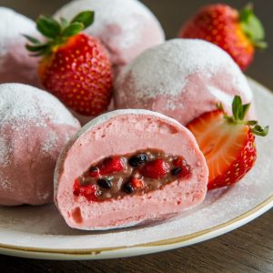 | Mochi Bites Strawberry | 10pcs mochi bites rasa stroberi , isian buah stroberi segar, topping/cocolan cream cheese dan oreo crumble |